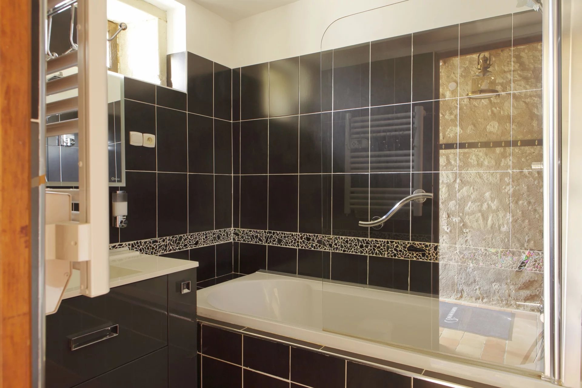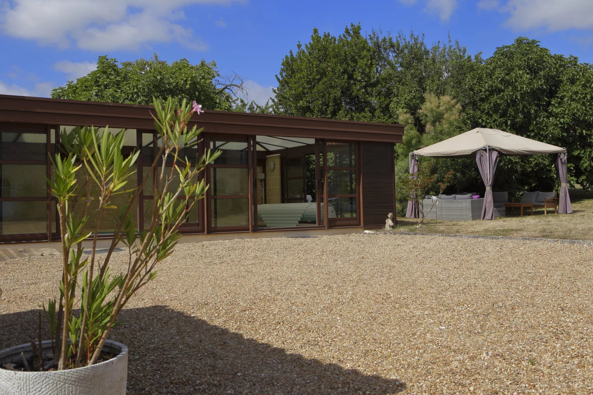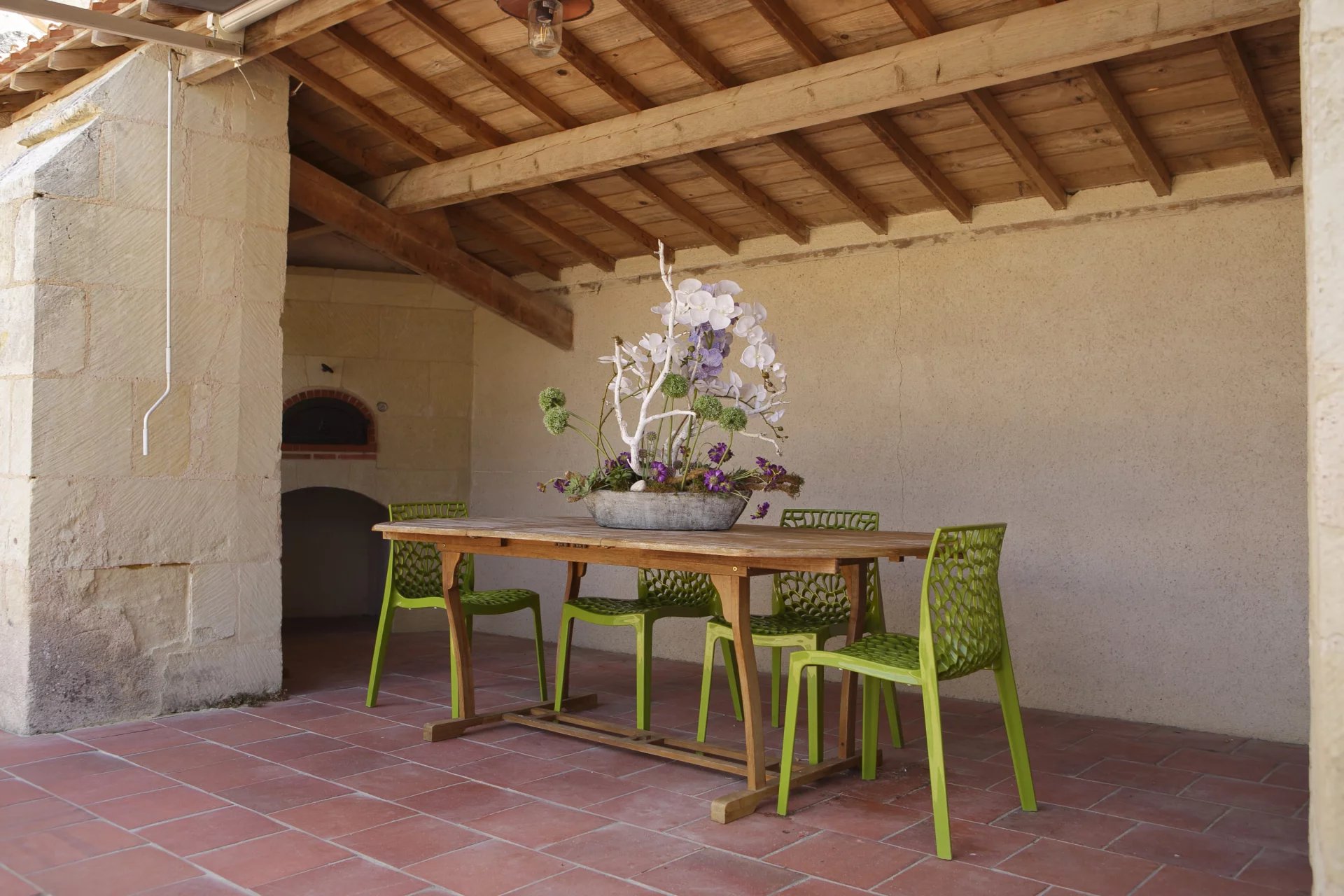 À l’extérieur, la propriété se poursuit avec différents espaces dédiés aux moments de partage : une terrasse couverte avec four à pain, une lingerie et une cuisine d’été fonctionnelle.