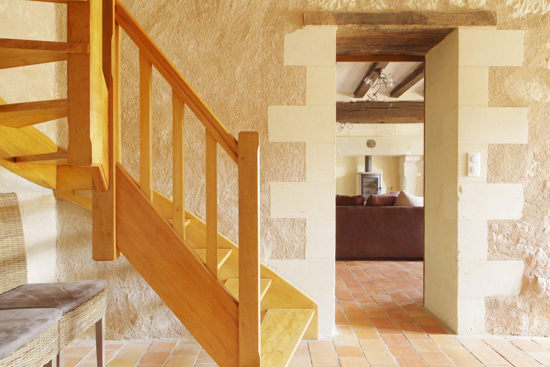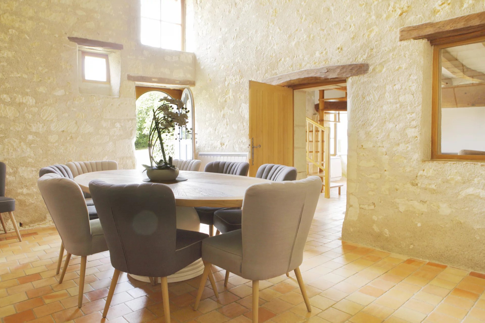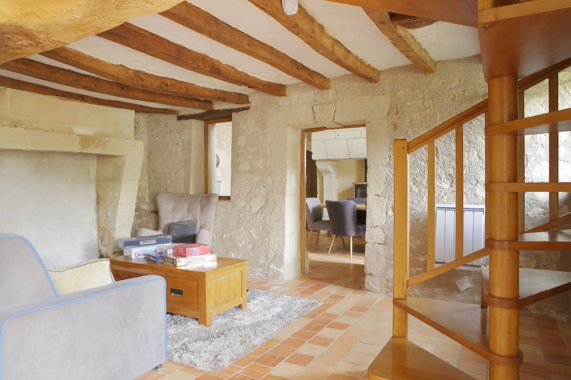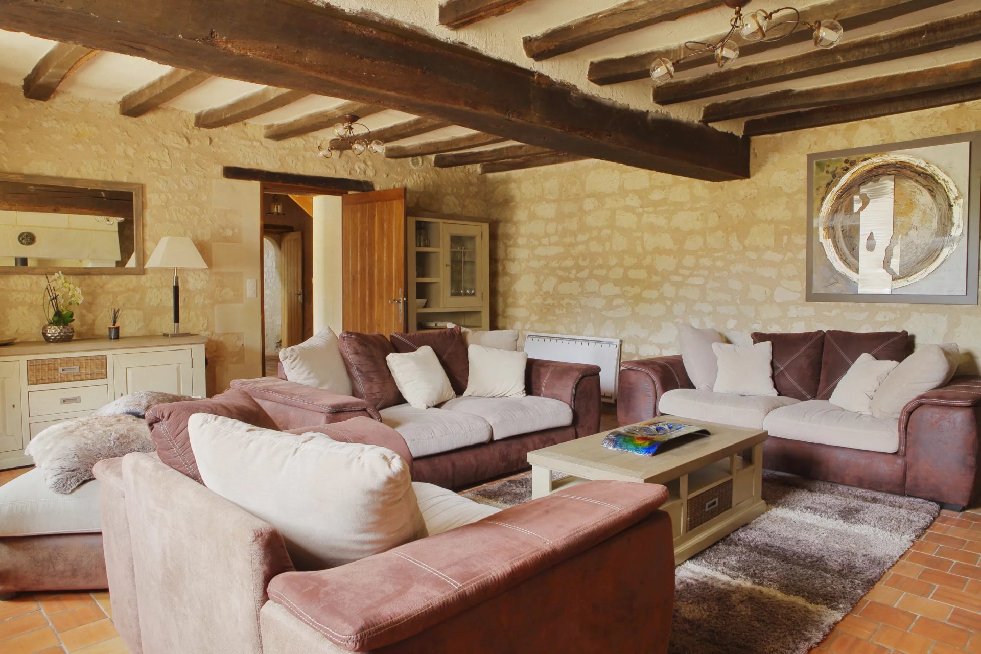 La maison principale s’articule autour de pièces de vie chaleureuses où l’on retrouve tomettes, poutres apparentes et cheminées en pierre.