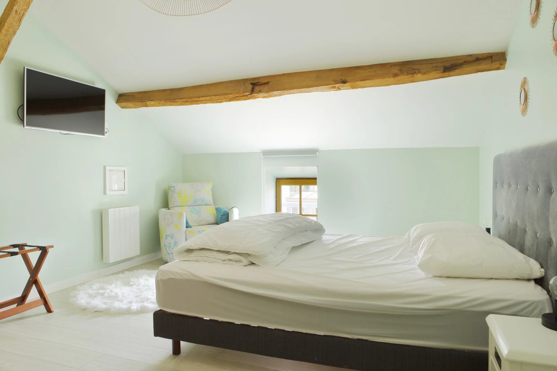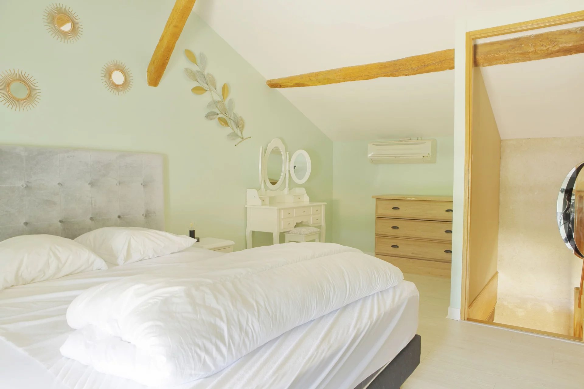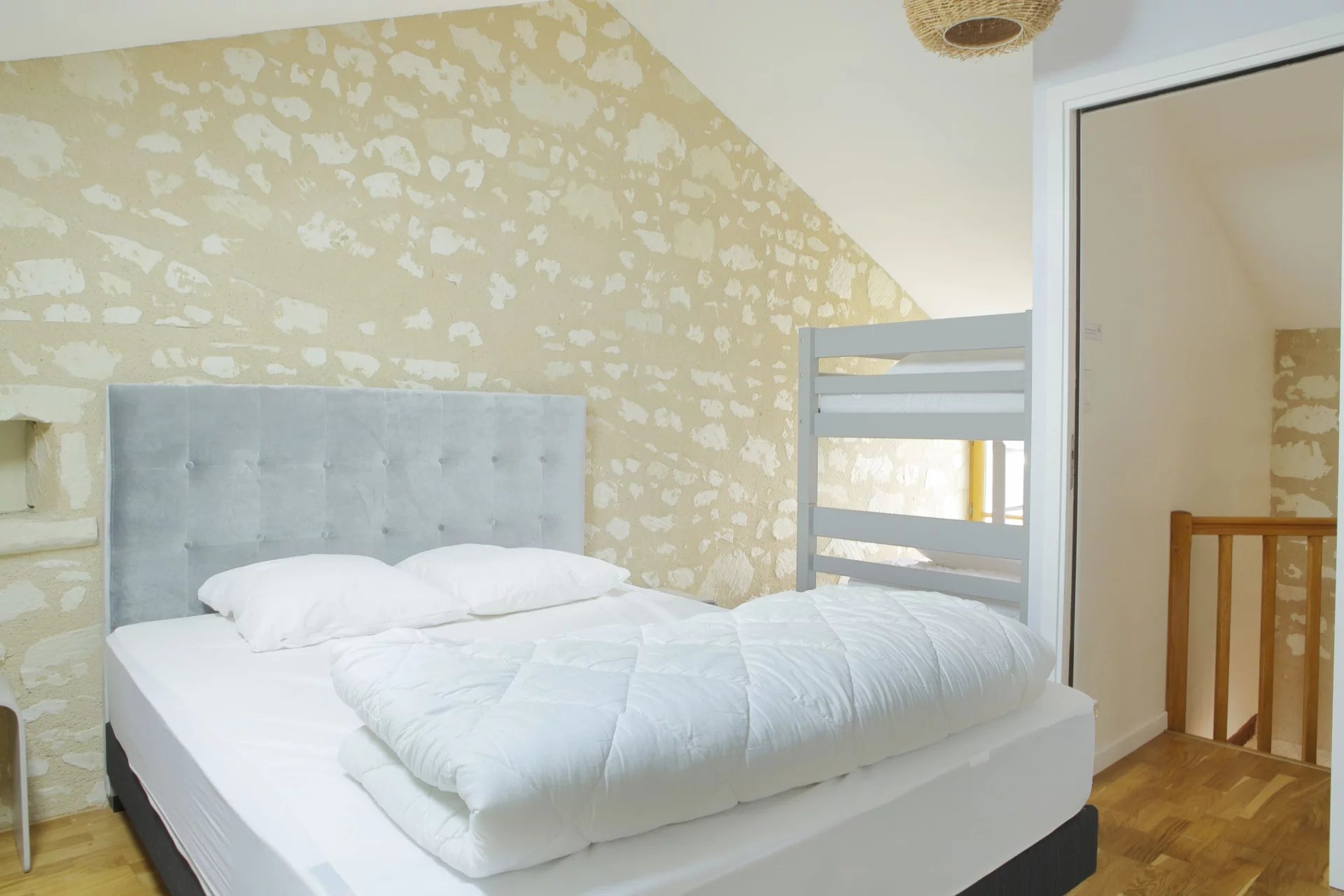 L’étage présente une organisation atypique : trois escaliers indépendants mènent à une suite parentale composée d’un salon, d’une chambre et d’une salle d’eau avec WC, ainsi qu’à trois autres chambres lumineuses.